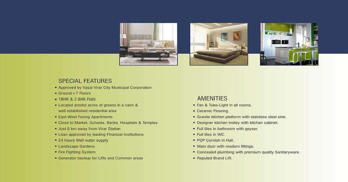 This project offers lavish 1, 2 & 3 BHK, Office & Shop well planned apartments as per your need. The best thing here is 24 hrs. water supply. All the needs like market, school, Banks, Hospital & Temples are nearby. Another attraction of Agashi is the beautiful Arnala beach and the famous Arnala fort. It is Just 3.5Km away from Agashi, that makes it a perfect evening drive after a hectic day at work.